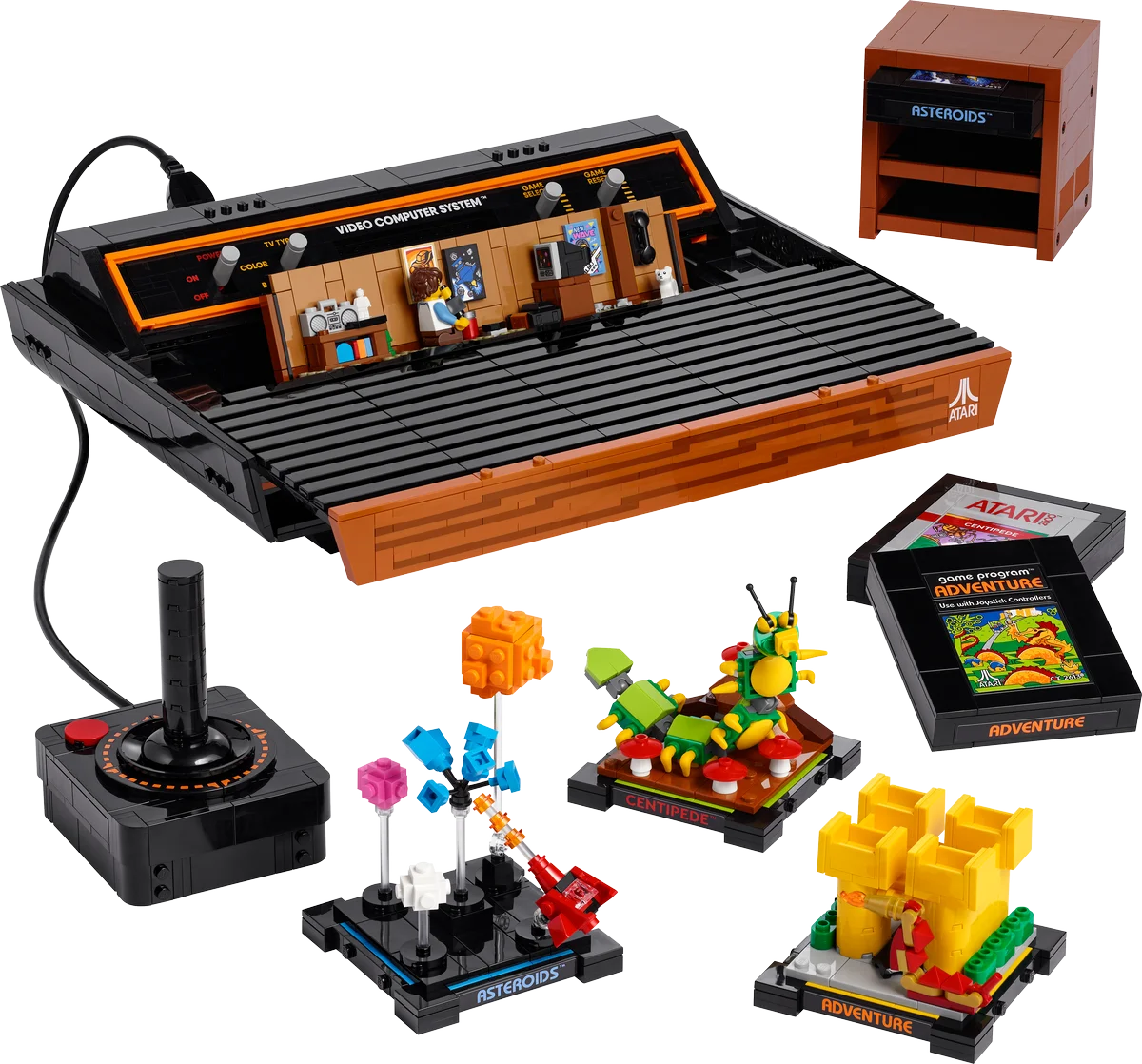 Disfruta montando la consola Atari® 2600 con su emblemático diseño de madera, inserta los cartuchos como en la original y revive la magia de tres videojuegos legendarios: Asteroids™, Adventure y Centipede™. Cada cartucho incluye una viñeta construible inspirada en su historia: naves espaciales, castillos encantados y ciempiés pixelados que cobran vida en ladrillos.
