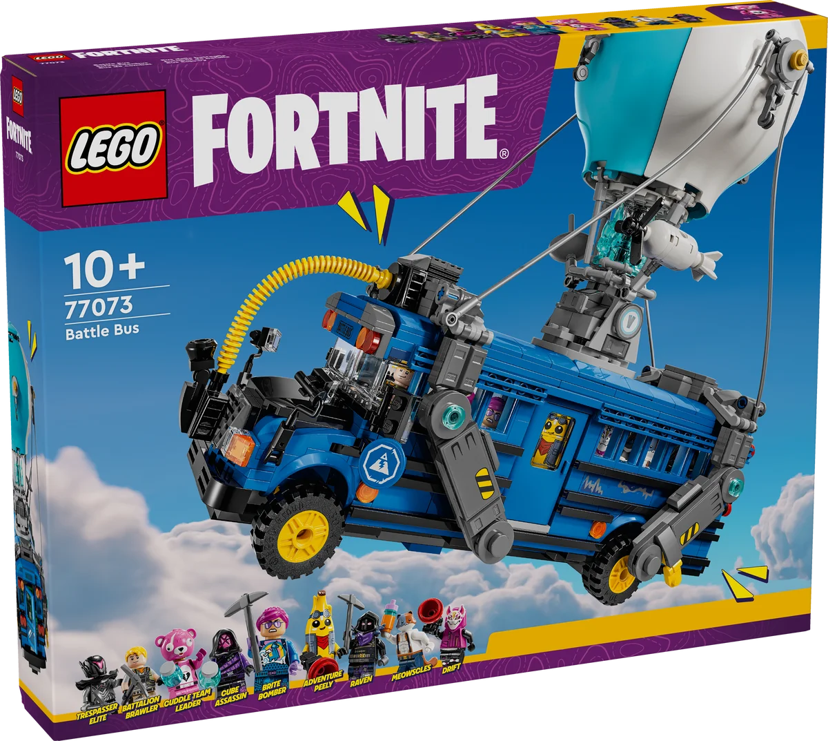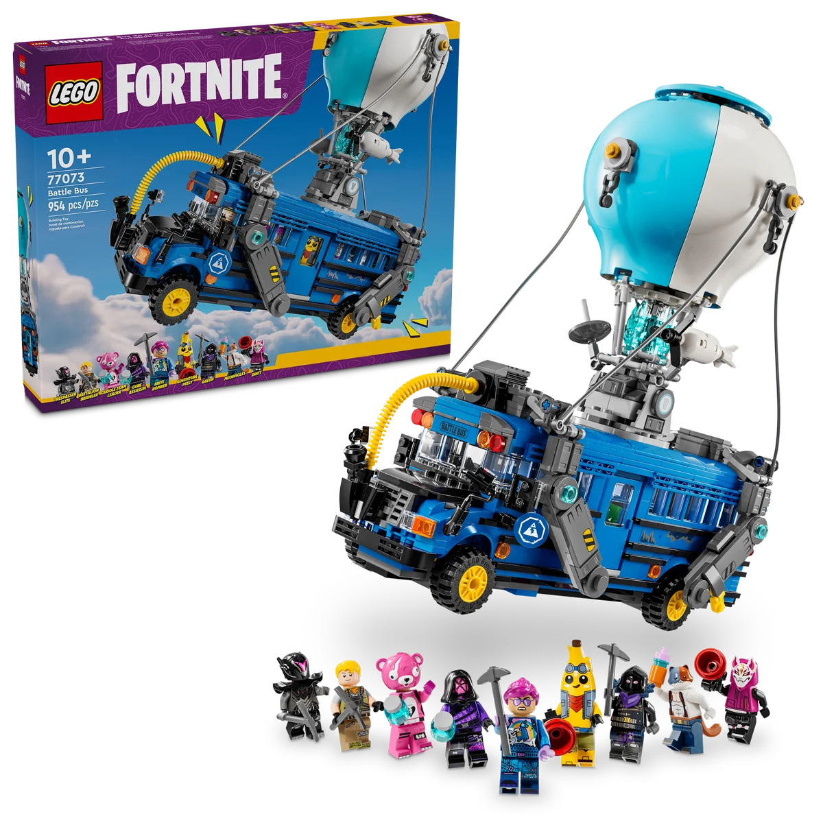 Este set de 954 piezas viene acompañado de 9 minifiguras LEGO® Fortnite con algunos de los trajes más queridos por los jugadores: Pendenciero del pelotón, Banano aventurero, Bombardera brillante, Líder del equipo arrumacos, Asesina del cubo, Intruso de élite, Deriva, Miaúsculos y Cuervo. ¡Todo listo para la acción!