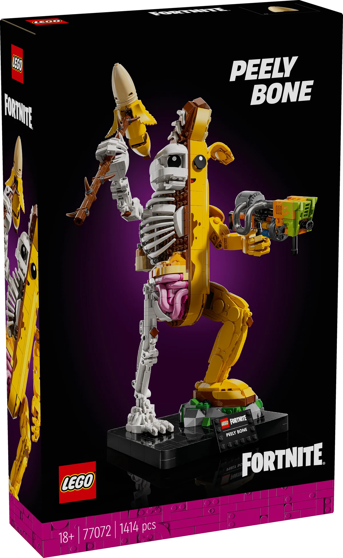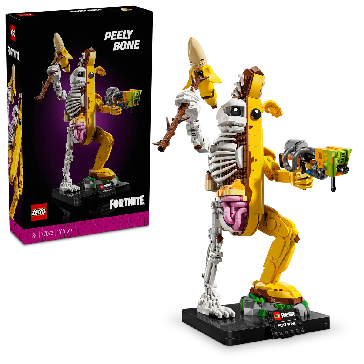 Recrea al carismático Banano en su versión mitad plátano, mitad esqueleto con 1414 piezas y una altura aproximada de 36 cm. El modelo cuenta con brazos y muñecas móviles para una postura dinámica y viene acompañado de su inconfundible pico pelado, lanzador de pintura y el accesorio mochilero petate de potasio.