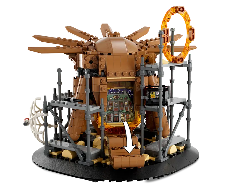 Viene con 3 soportes para minifiguras que simulan escenas aéreas, un techo desmontable que revela a Sandman, una telaraña flexible para capturar villanos y un portal trasero para añadir dimensión al juego y la exposición.