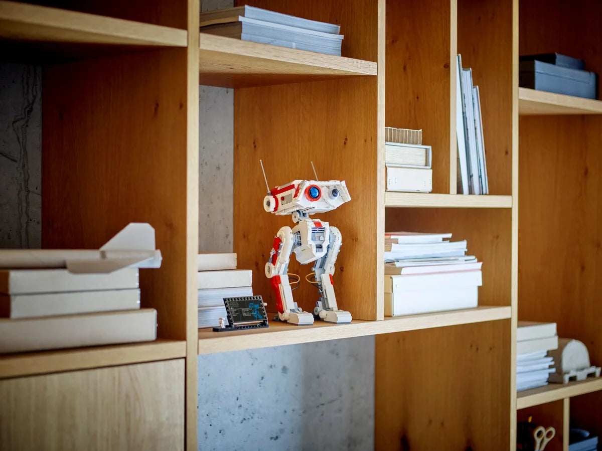 Este modelo de 1062 piezas incluye una placa informativa y una figura LEGO® de BD-1 para completar la exposición. Con una altura aproximada de 31 cm, es perfecto para decorar tu espacio de trabajo, estantería o sala de juegos.