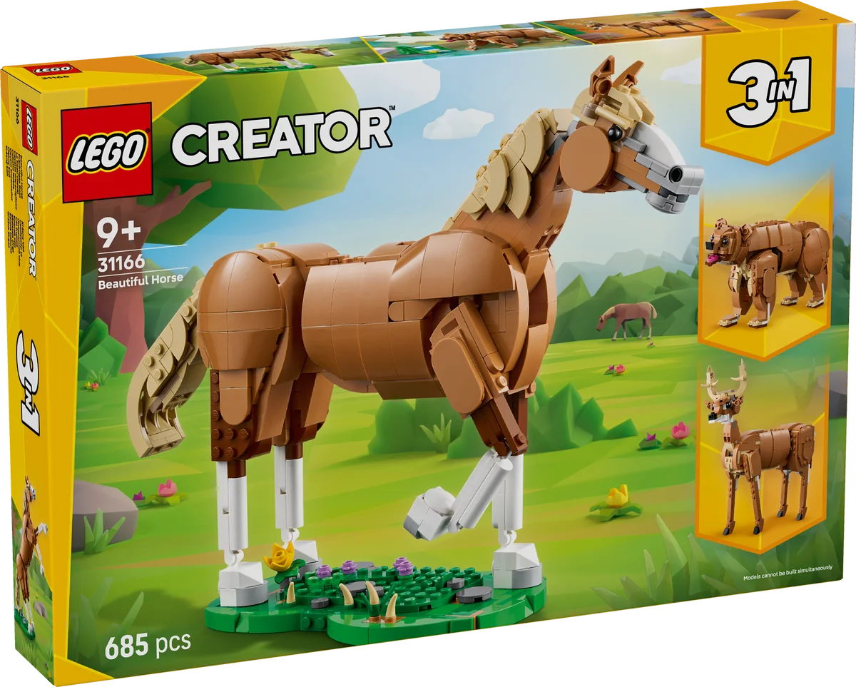 Con el set LEGO® Creator 3en1 Caballo Noble 31166, niños y niñas a partir de 9 años podrán dar vida a emocionantes historias protagonizadas por sus animales favoritos. Este versátil juguete 3en1 permite construir un caballo articulado, un oso con cascada o un ciervo elegante… ¡todo con las mismas piezas!
