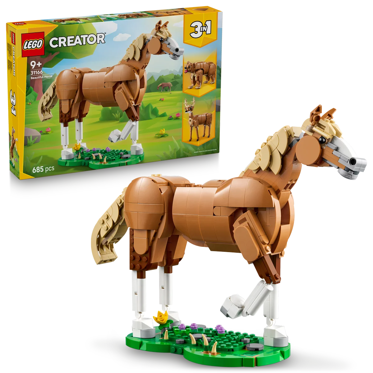 El caballo LEGO puede adoptar 3 posturas diferentes gracias a su estructura articulada (cabeza, cuello, patas, rodillas y cola móviles), y viene con una base decorativa con efecto de hierba ideal para exponerlo como figura. Cambia de historia en cualquier momento reconstruyéndolo como un robusto oso o un estilizado ciervo, también totalmente articulados.