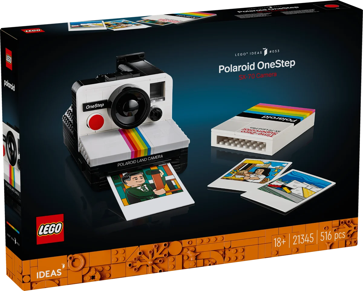 Con 516 piezas, este modelo LEGO reproduce con gran realismo la icónica Polaroid OneStep SX-70, incluyendo visor funcional, espectro de colores, rueda de exposición, disparador rojo y pegatinas personalizables con los logotipos “OneStep” o “1000”.