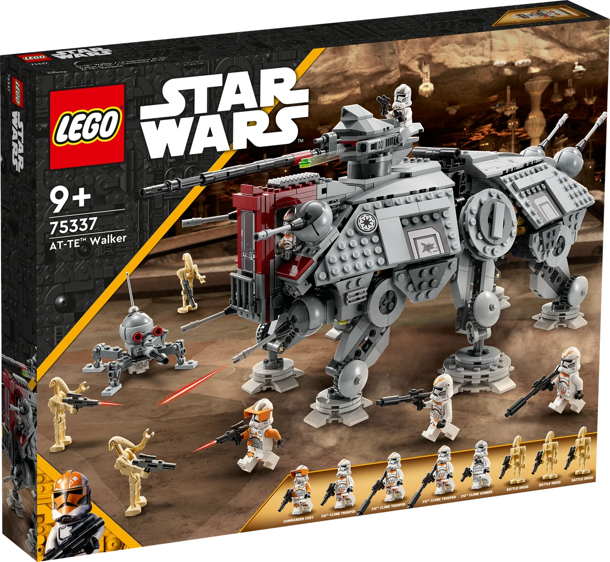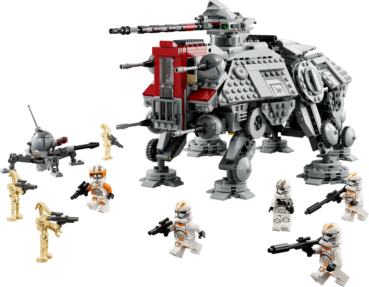 Este set incluye un AT-TE con patas articuladas, cañón bláster pesado elevable con rotación de 360°, dos cañones que disparan, y cabinas accesibles con espacio para hasta 7 minifiguras. El mango extensible permite transportarlo fácilmente de una batalla a otra.