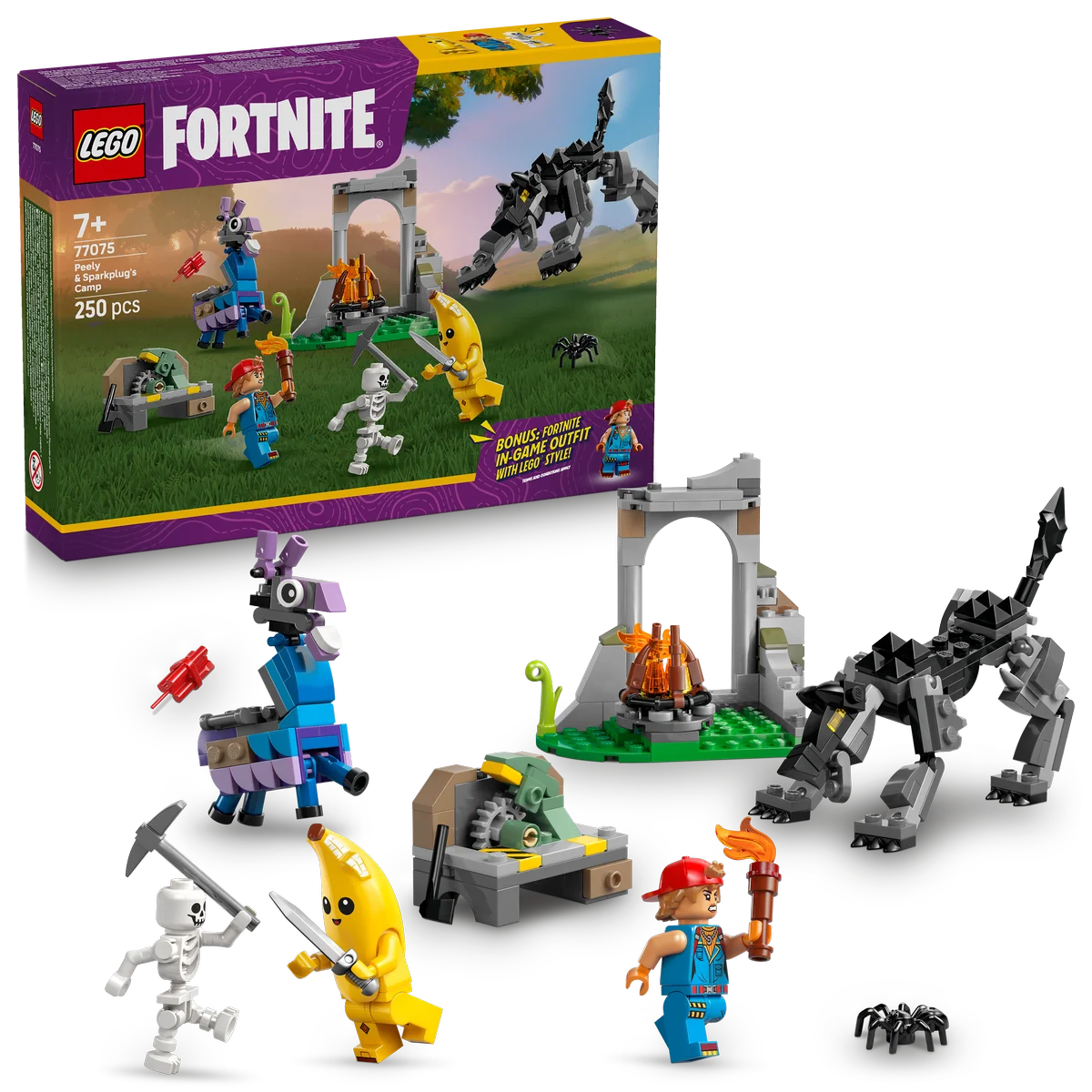 Descubre la acción y creatividad del universo Fortnite con el set LEGO® Fortnite® Campamento de Banano y Bujía (#77075). Diseñado para niños y niñas a partir de 7 años, este set permite vivir las primeras misiones del videojuego *LEGO Fortnite Odyssey* en el mundo real, con elementos y personajes icónicos.