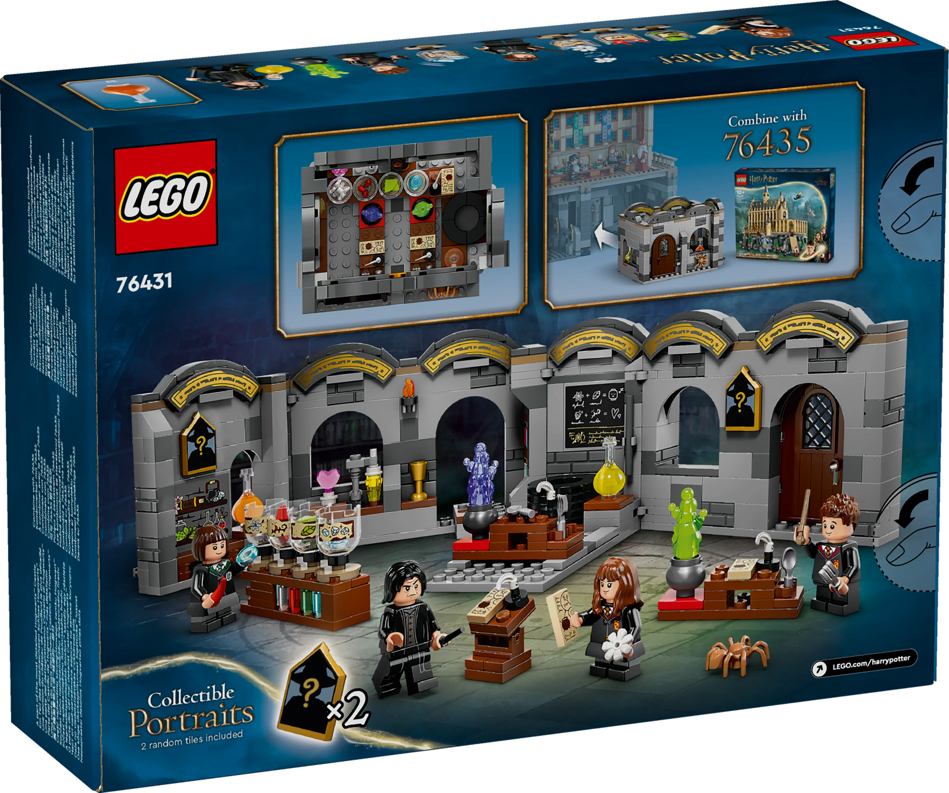 Este juego incluye 4 minifiguras —Severus Snape™, Hermione Granger™, Pansy Parkinson y Seamus Finnigan— y una aula que se abre para jugar cómodamente. Contiene una pizarra con instrucciones de pociones, frascos de ingredientes, un caldero, y más detalles auténticos de las películas. Además, el set viene con 2 cuadros de Hogwarts™ coleccionables (de 14 disponibles) para decorar el aula.