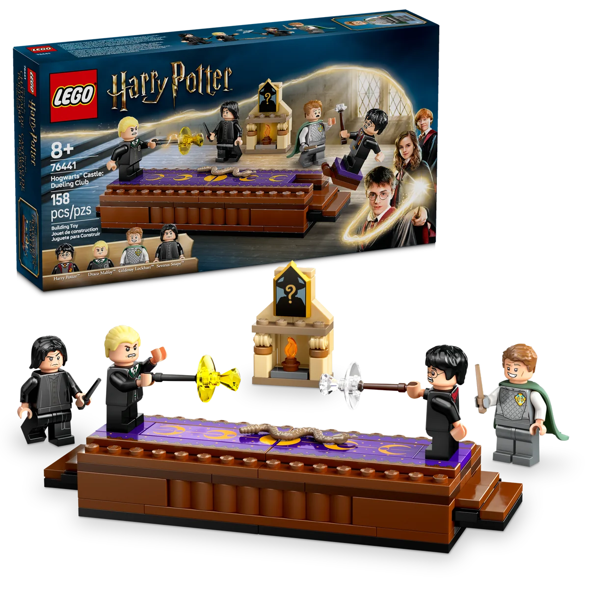 El set incluye una plataforma decorada con función de duelo: ¡empuja los escalones para derribar a la minifigura rival! Trae también 4 minifiguras LEGO de personajes icónicos: Harry Potter, Draco Malfoy (ambos con varitas y hechizos), Gilderoy Lockhart y Severus Snape. Además, podrás exponer 1 cuadro de Hogwarts coleccionable (de los 14 disponibles) sobre la chimenea.