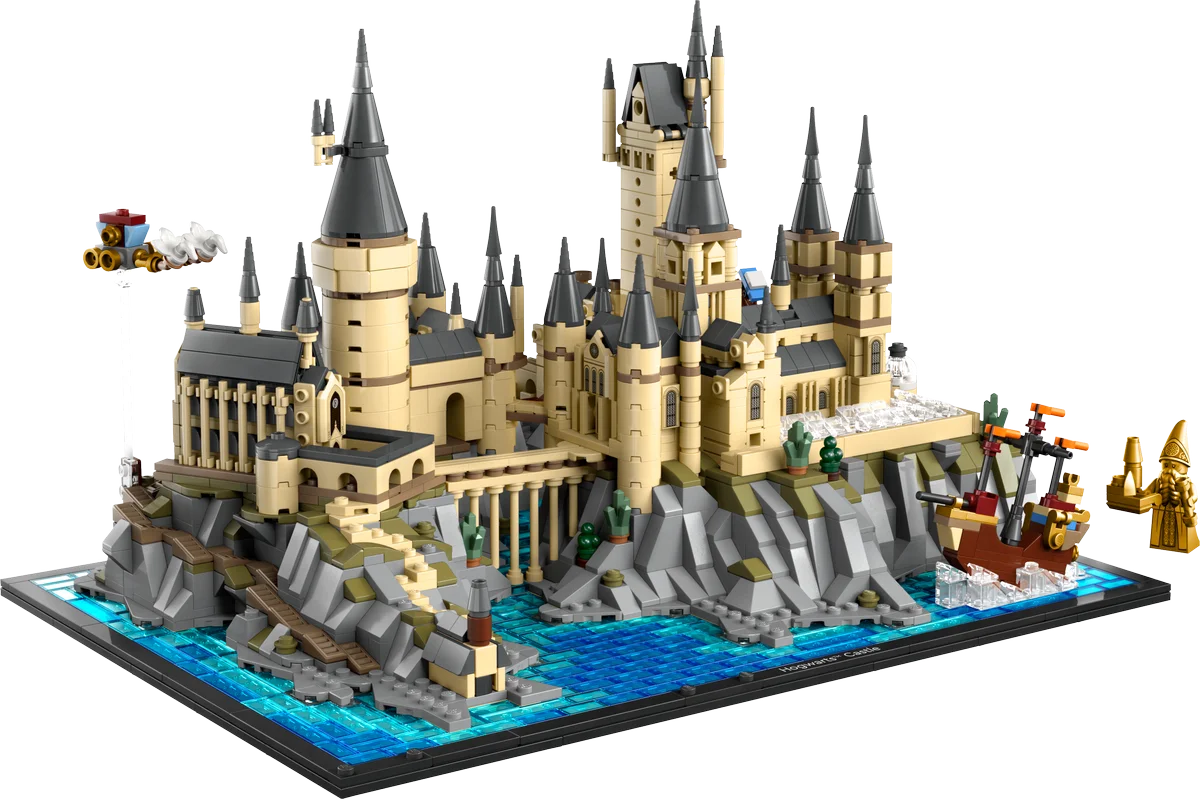 Además, cuenta con versiones en miniatura del Barco de Durmstrang, el Carruaje de Beauxbatons y el Ford Anglia atrapado en el Sauce Boxeador. Como broche final, incorpora una minifigura dorada del arquitecto de Hogwarts™ y una placa decorativa con el nombre del castillo.