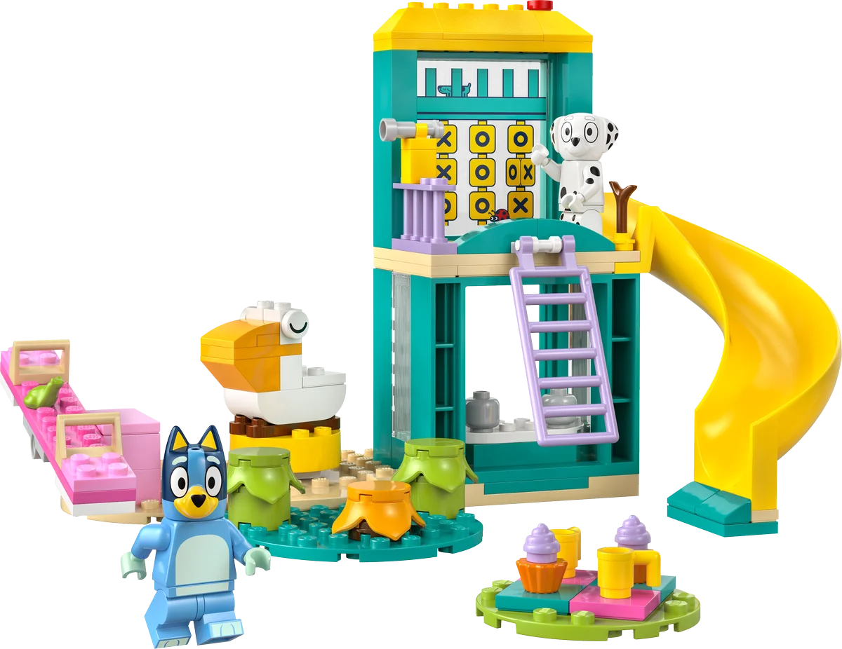 El colorido parque incluye un balancín, tobogán, trepador, pelícano giratorio y hasta una torre con telescopio. También cuenta con una zona de pícnic con dulces y bebidas, y plataformas para saltar. Todo ello acompañado por las queridas minifiguras de Bluey y Chloe.