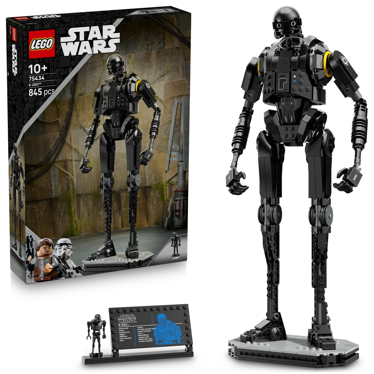- Base de exposición con una placa informativa y espacio para la figura LEGO de K-2SO en tamaño normal, también incluida.