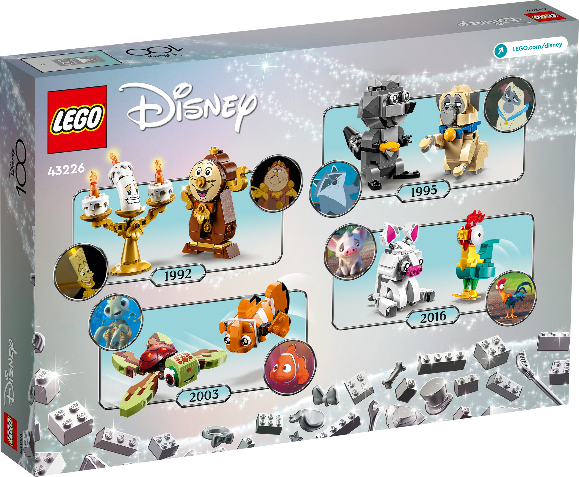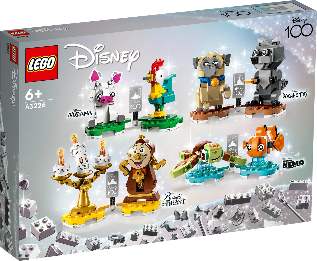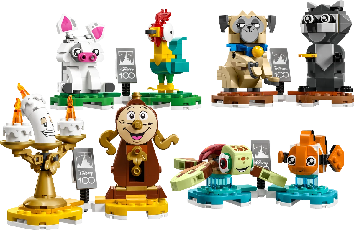 Incluye las adorables parejas de Din-Don y Lumière (La Bella y la Bestia), Púa y Heihei (Vaiana), Nemo y Squirt (Buscando a Nemo), y Meeko y Percy (Pocahontas). Cada dúo viene con una base de exposición conectable con un elemento conmemorativo del 100 aniversario de Disney.