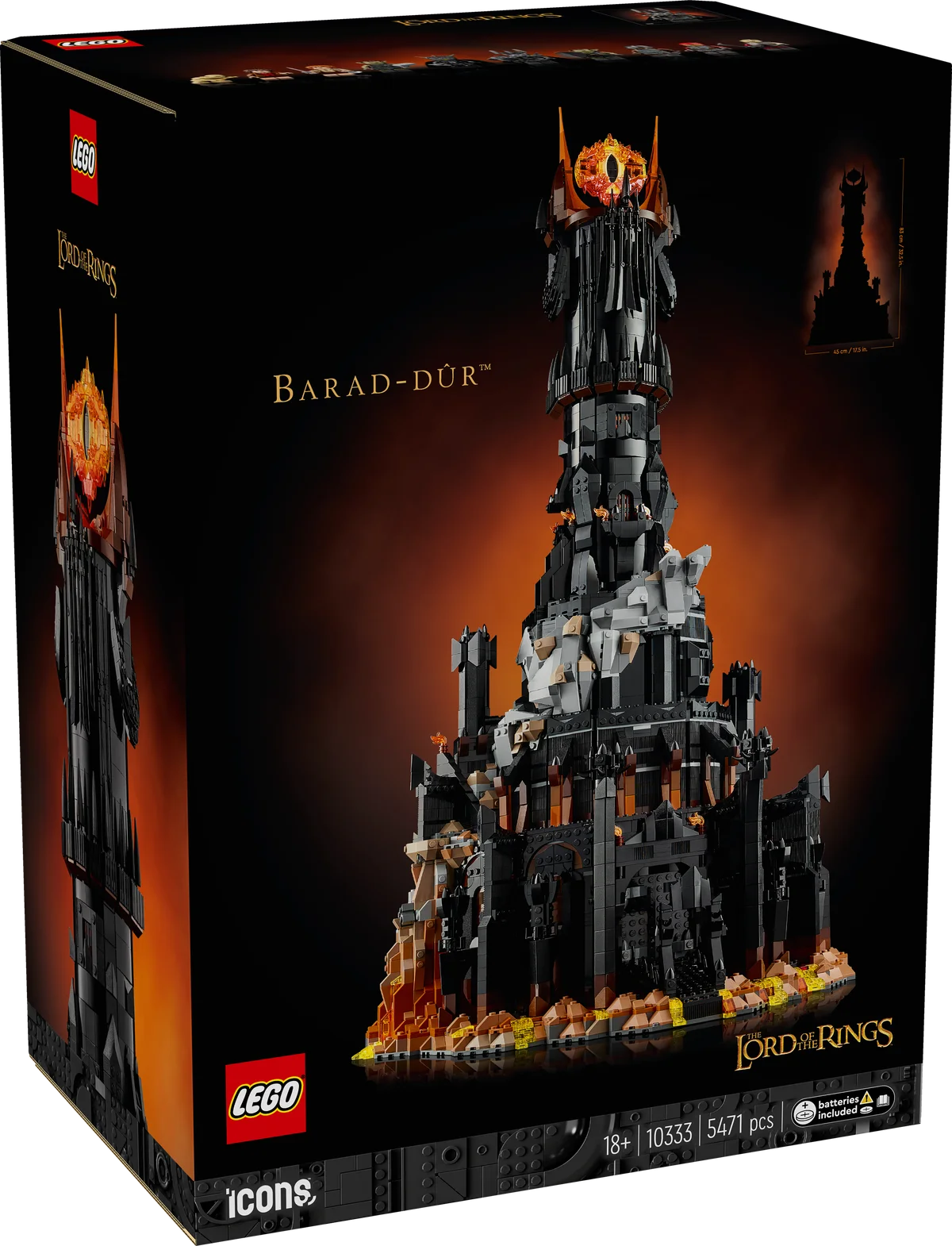 Adéntrate en el corazón del poder oscuro con el set LEGO® Icons El Señor de los Anillos: Barad-dûr™, una maqueta de exposición monumental inspirada en la imponente fortaleza de Mordor. Diseñada para constructores adultos y coleccionistas apasionados por la obra de Tolkien, esta recreación está repleta de detalles cinematográficos y funciones interactivas que la convierten en una pieza absolutamente legendaria.