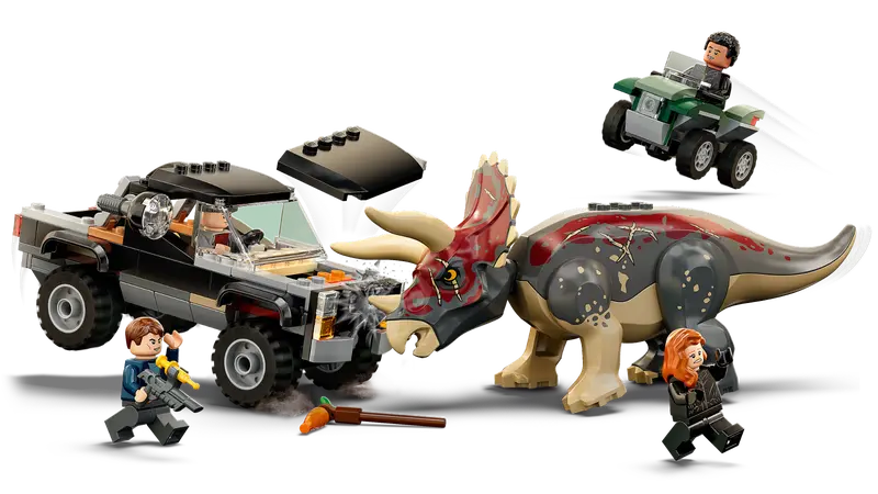 Incluye una figura articulada de un Triceratops capaz de embestir la parte frontal desmontable de la furgoneta. Pero no te preocupes, ¡puede reconstruirse fácilmente para volver al juego una y otra vez!