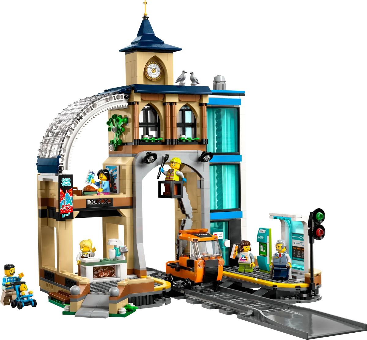 El set también incluye un automotor de mantenimiento con plataforma elevadora y 6 minifiguras, una figura de bebé y 2 figuras de palomas. ¡Una combinación perfecta para enriquecer la narrativa urbana y fomentar el juego de roles!