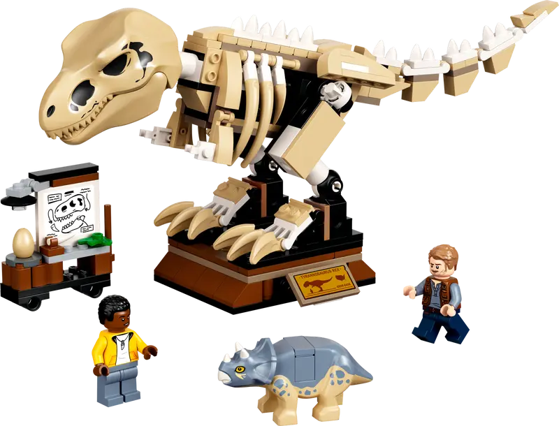 Este juego incluye una maqueta articulada de un T. rex fosilizado que se monta sobre una base de exposición tipo museo. Además, contiene una figura de una cría de Triceratops, una pizarra construible con puntero, minifiguras de Darius y Owen Grady (inspiradas en Jurassic World: Campamento Cretácico) y accesorios como un huevo de dinosaurio y dientes fosilizados.