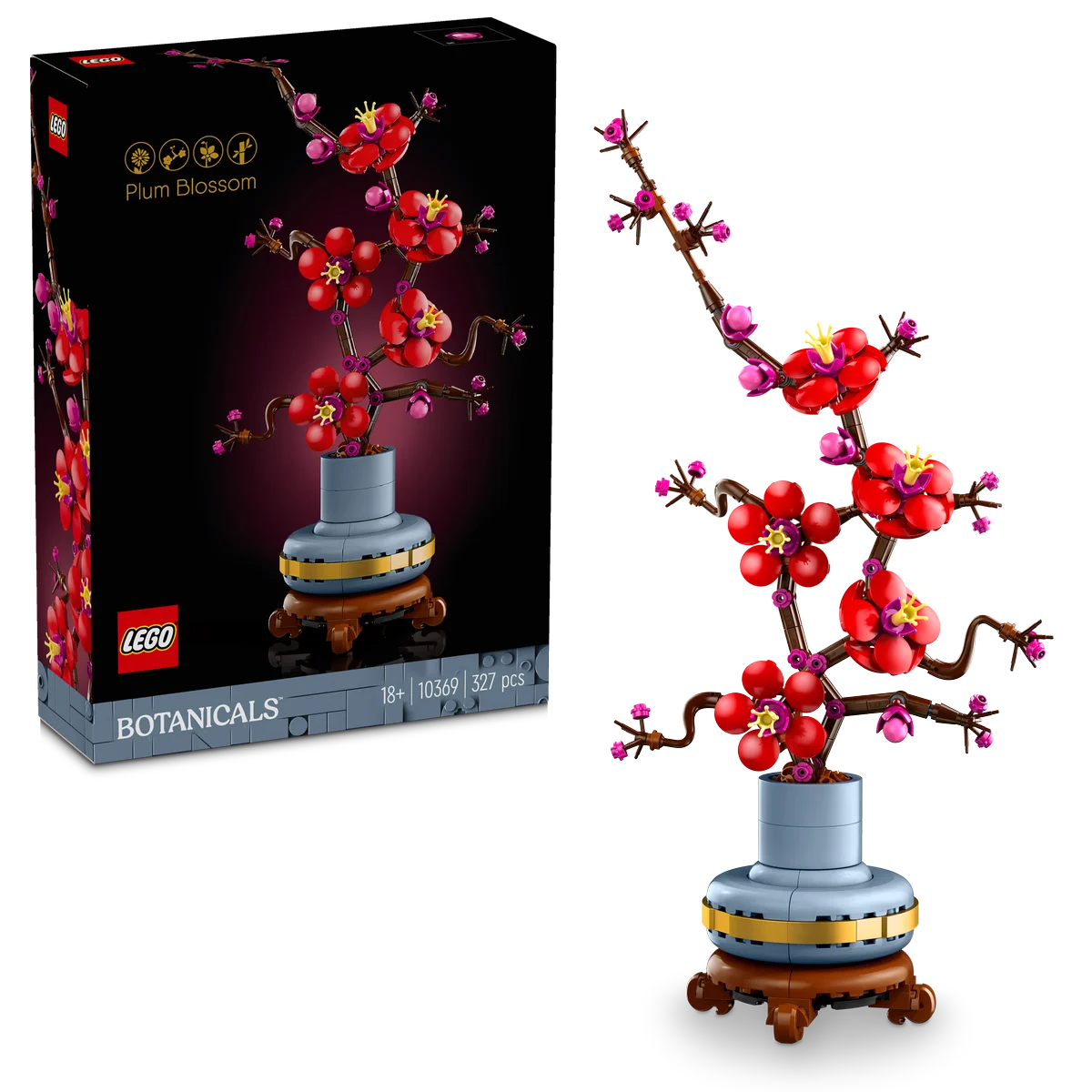 Este set incluye una rama con flores rojas y magentas, una maceta azul pastel con banda dorada y una peana que imita la madera, creando un conjunto que transmite armonía y belleza natural. Con 327 piezas, es fácil de montar y ofrece una experiencia de construcción gratificante para constructores de todos los niveles.