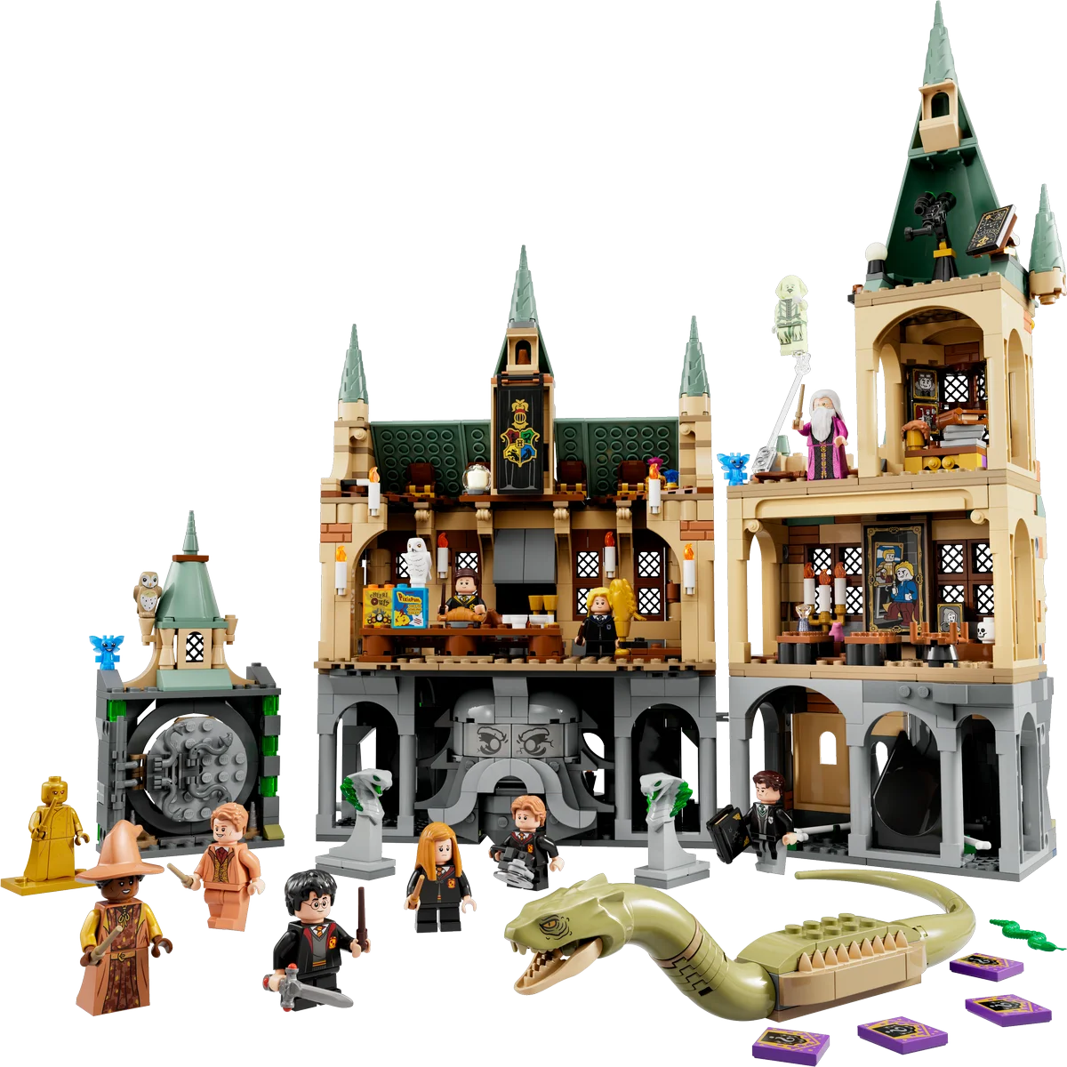 Este impresionante set modular recrea dos ubicaciones clave del universo de Harry Potter: el Gran Comedor, con sus mesas, el atril dorado de Dumbledore y el Sombrero Seleccionador; y la Cámara Secreta, con su entrada circular, la estatua de Salazar Slytherin y una boca que se abre para liberar al Basilisco articulado.