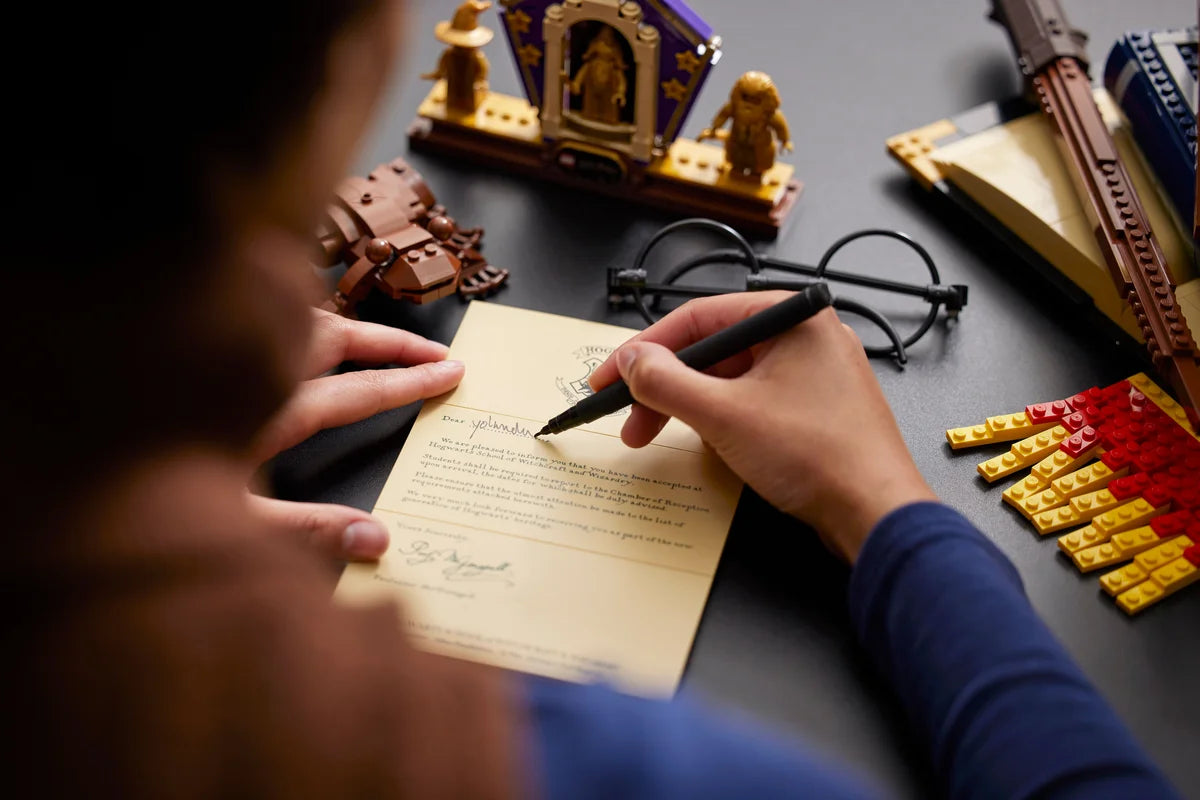 Coronada por la majestuosa Hedwig™, que sostiene una carta de admisión a Hogwarts™, esta detallada composición viene acompañada de 3 minifiguras doradas exclusivas por el 20 aniversario: Albus Dumbledore™, Minerva McGonagall™ y Rubeus Hagrid™.