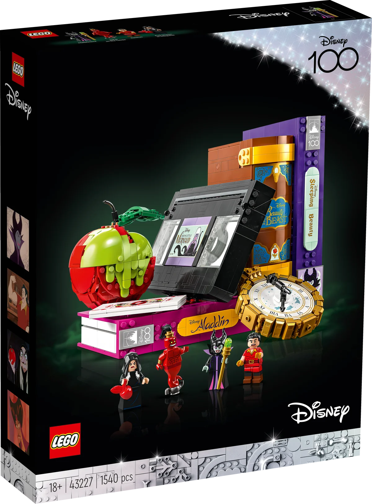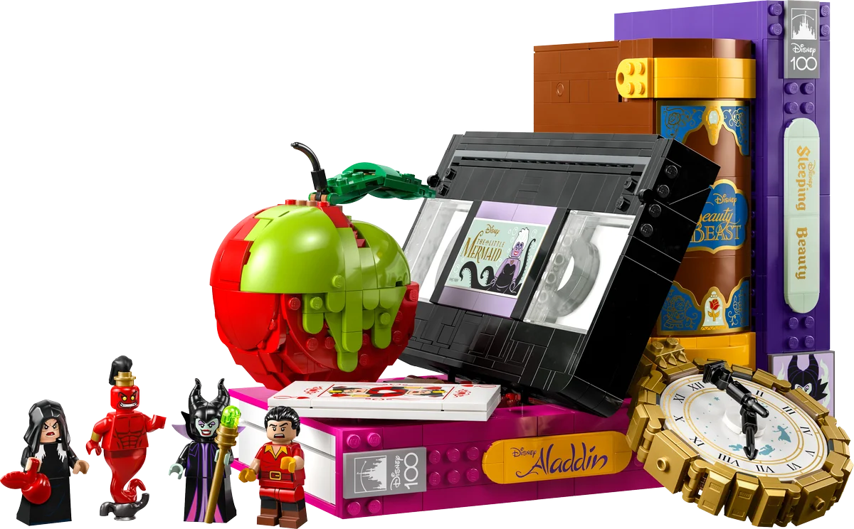 Ocultas entre los objetos, encontrarás 4 minifiguras LEGO® ǀ Disney de villanos: Maléfica, la Reina Malvada disfrazada, Gastón y el Genio Jafar. Cada una añade un toque siniestro y carismático al conjunto, que también puede colocarse como original sujetalibros de exposición.