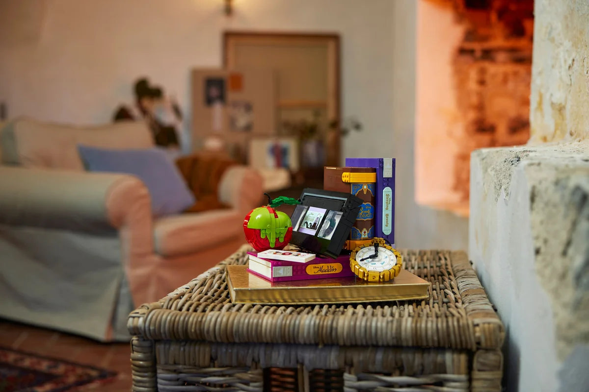 Este set para construir y exponer incluye 2 estuches de cintas VHS de “Aladdín” y “La Bella Durmiente”, una cinta de “La Sirenita”, un libro de “La Bella y la Bestia”, una manzana envenenada de “Blancanieves”, un naipe de la Reina de Corazones y un reloj de bolsillo de “Peter Pan”. Cada elemento está cargado de nostalgia, perfecto para los amantes del diseño y el cine clásico de animación.