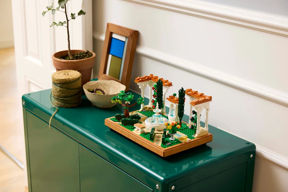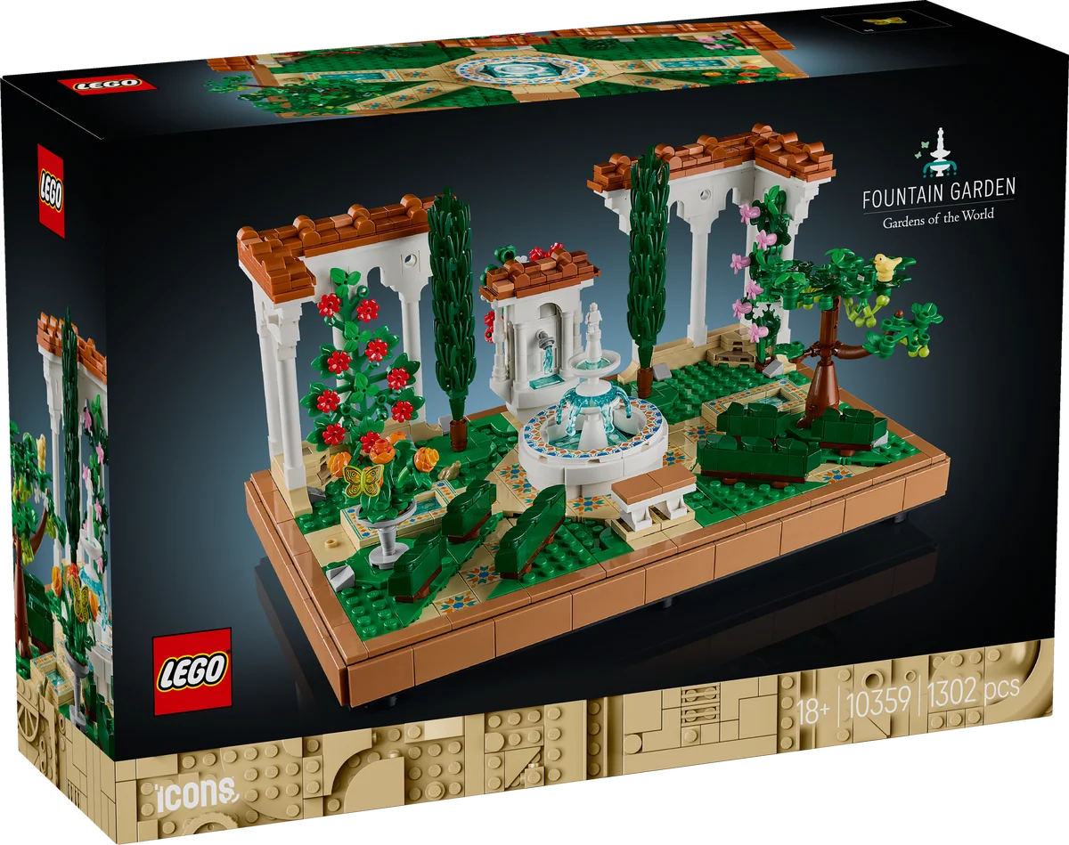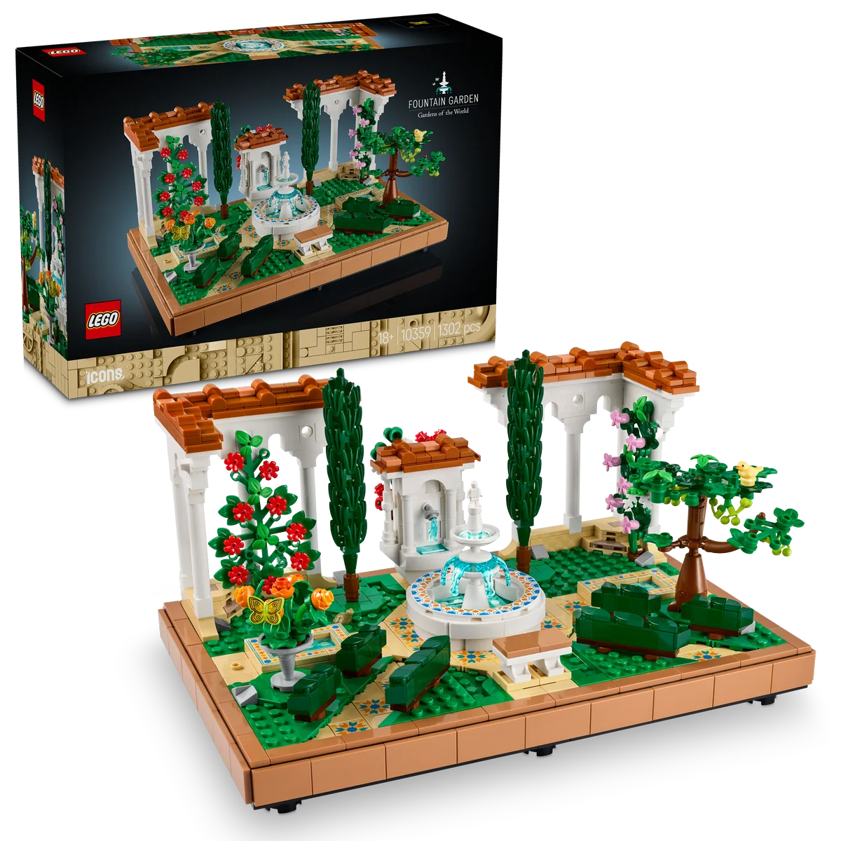 Transforma tu espacio con el set Jardín con Fuente LEGO Icons y celebra la armonía natural en cada ladrillo.