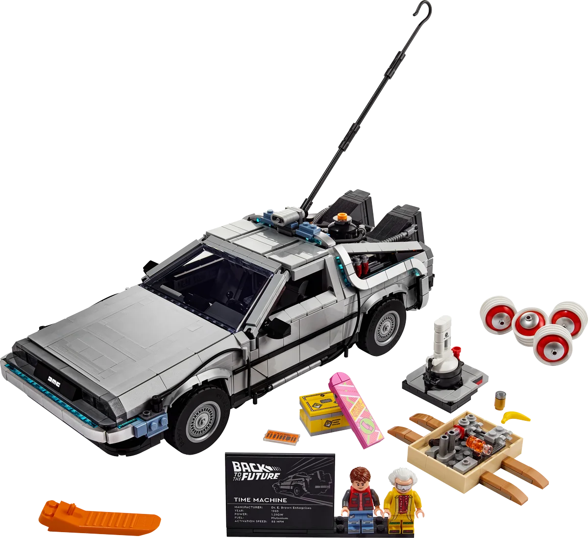 - Incluye 2 minifiguras: Doc Brown y Marty McFly, junto al aeropatín y las matrículas "OUTATIME" y del futuro.