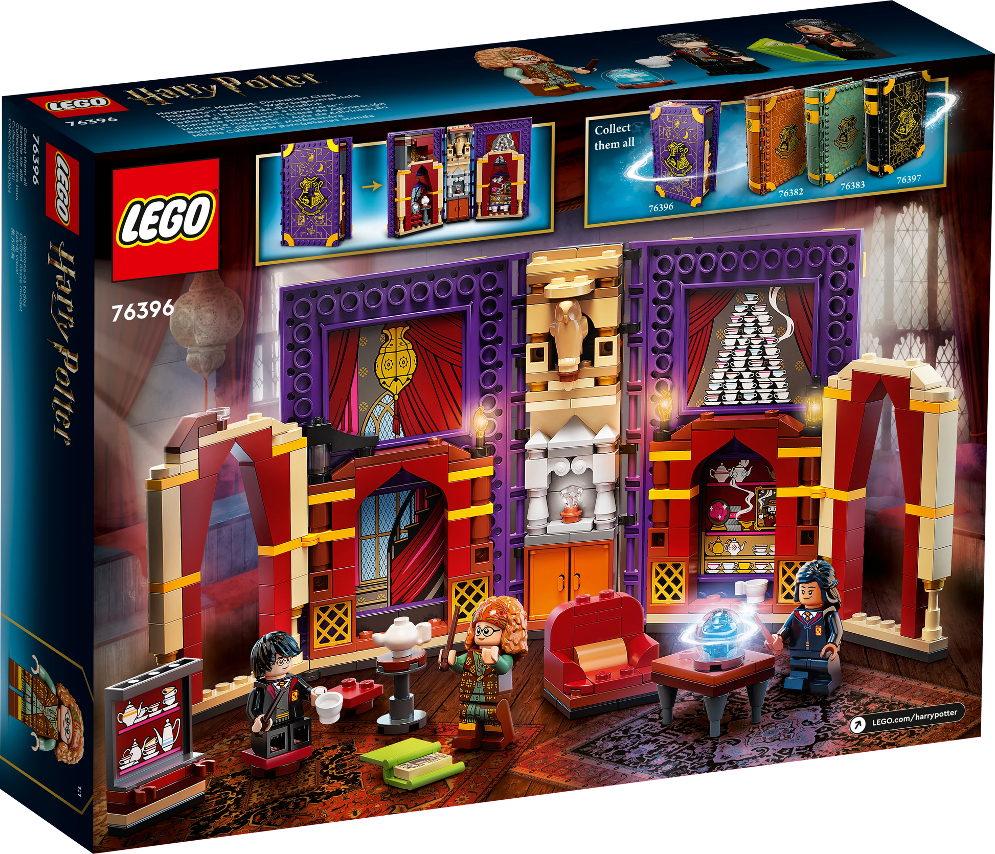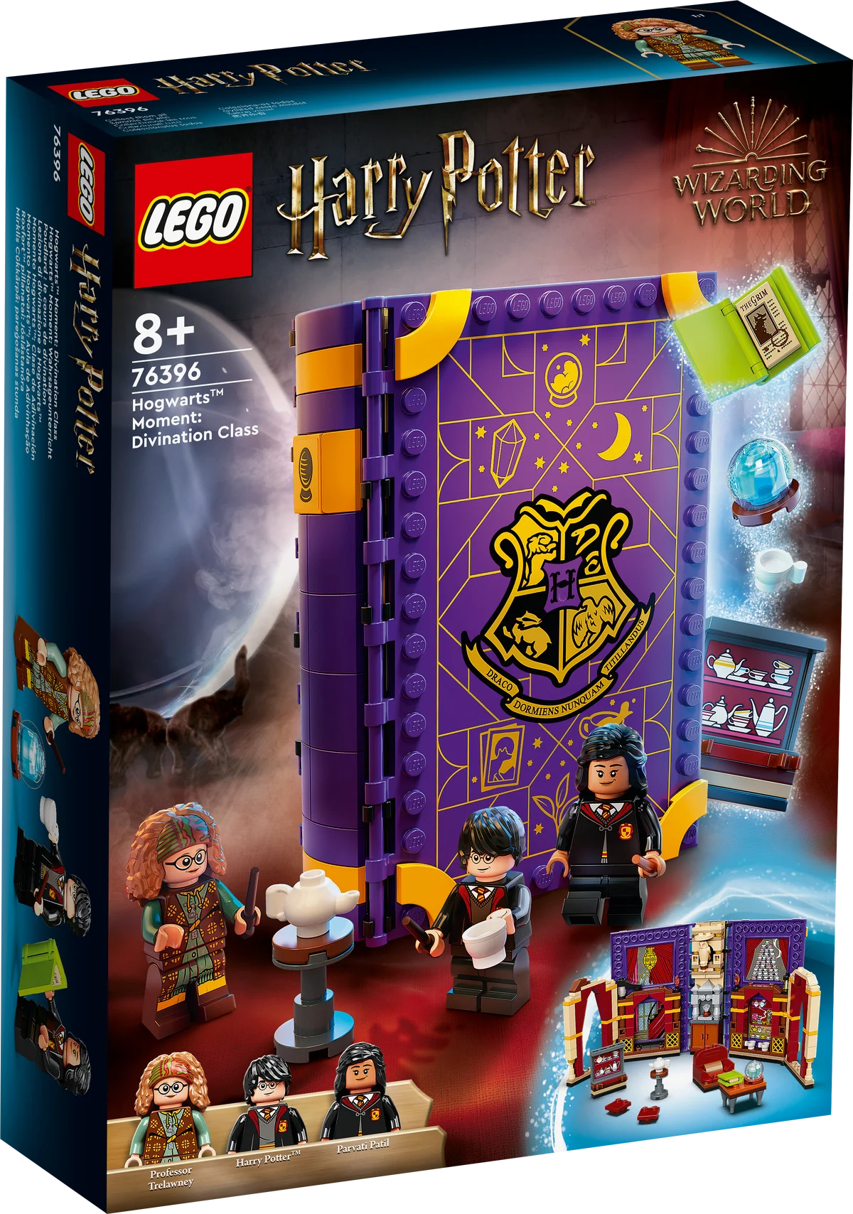 Incluye 3 minifiguras: Harry Potter™, Parvati Patil y la Profesora Trelawney, junto a una bola de cristal, tazas de té, sillas, mesa, sillón y armario. Todo lo necesario para una clase inolvidable de lectura del futuro en Hogwarts™.