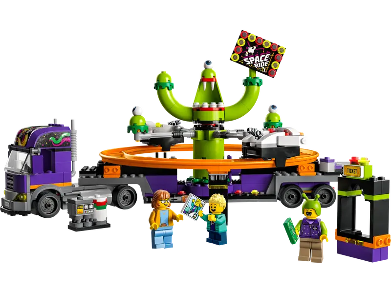 El set trae 3 minifiguras LEGO City listas para la aventura, además de accesorios divertidos como una taza, una cubierta con foto y un sombrero de extraterrestre. Todo preparado para montar historias dentro y fuera de la atracción.
