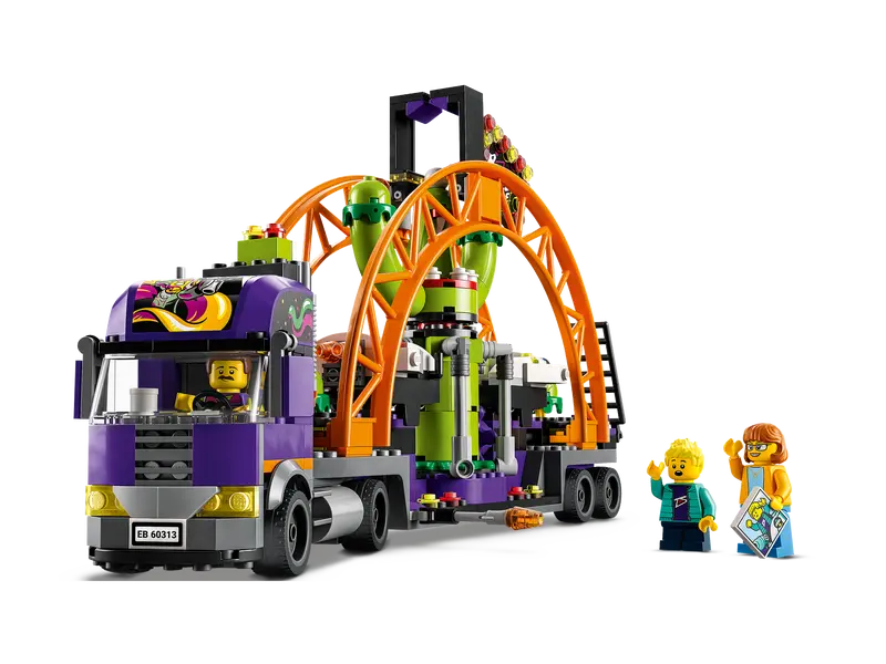 Este camión con remolque desenganchable se convierte en una espectacular atracción con vagones de montaña rusa y manivela giratoria. Los peques solo tienen que subir a las minifiguras y girar la manivela para iniciar el recorrido lleno de giros y diversión.
