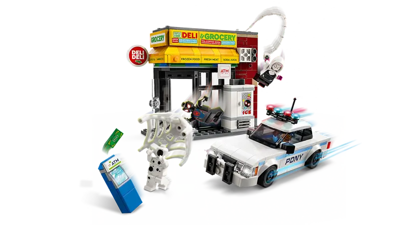 El escenario principal del set es un minisúper construible con una ingeniosa función de explosión que lanza la pared por los aires para que Mancha robe el cajero automático. ¡Ideal para recrear escenas llenas de adrenalina!