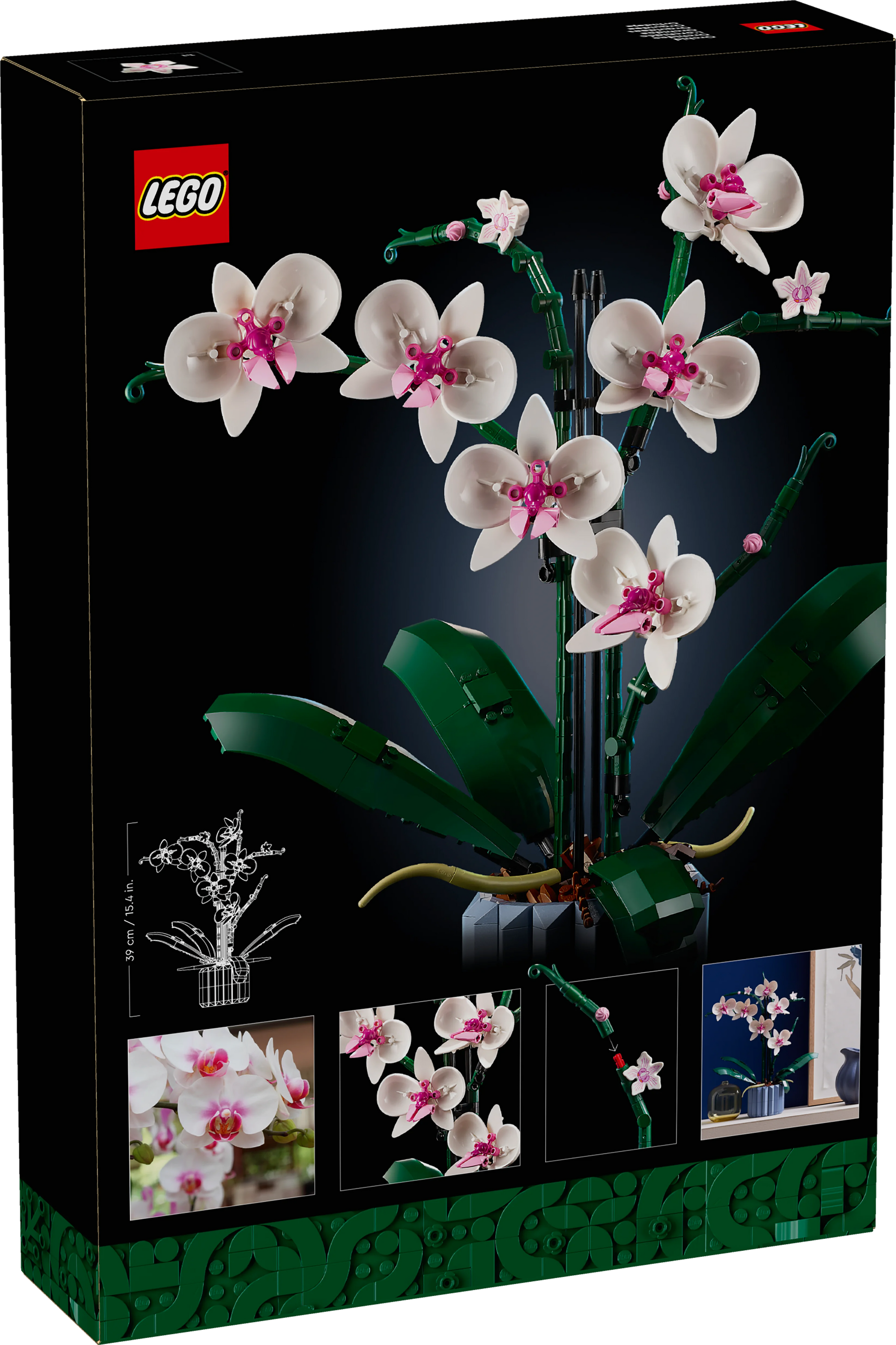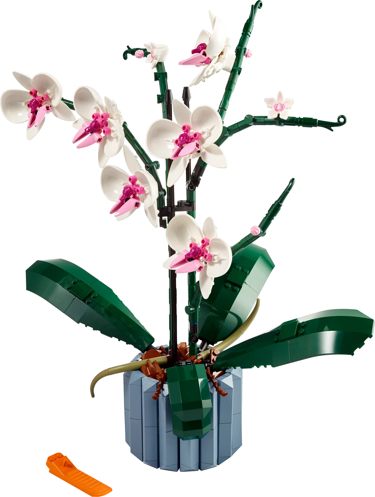 El set incluye flores blancas y rosas con detalles realistas, 5 hojas verdes en la base, 2 raíces aéreas y un jarrón azul estriado que se rellena con piezas marrones que simulan el sustrato natural de las orquídeas. Cada elemento ha sido diseñado con una extraordinaria atención al detalle, incluyendo el uso creativo de piezas LEGO reconvertidas, como escudos de minifiguras y colas de dinosaurios.