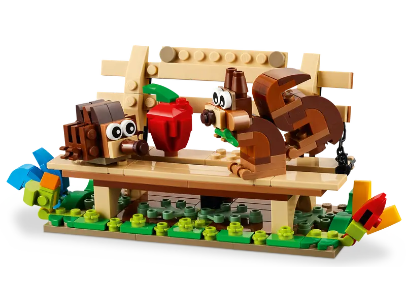 - Un banco de parque con un erizo y una ardilla, acompañado de una manzana como accesorio.