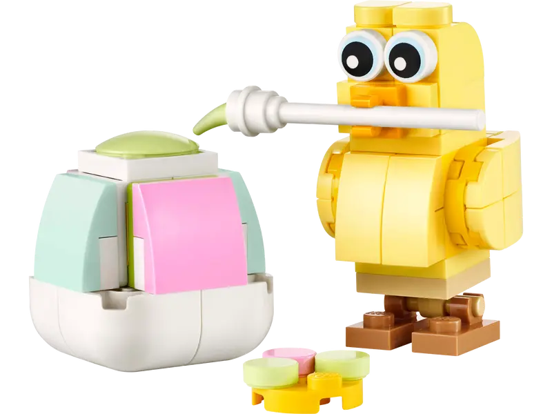Celebra la fiesta de Pascua con este divertido juego LEGO® formado por un adorable pollito que está decorando un huevo de Pascua con un pincel.