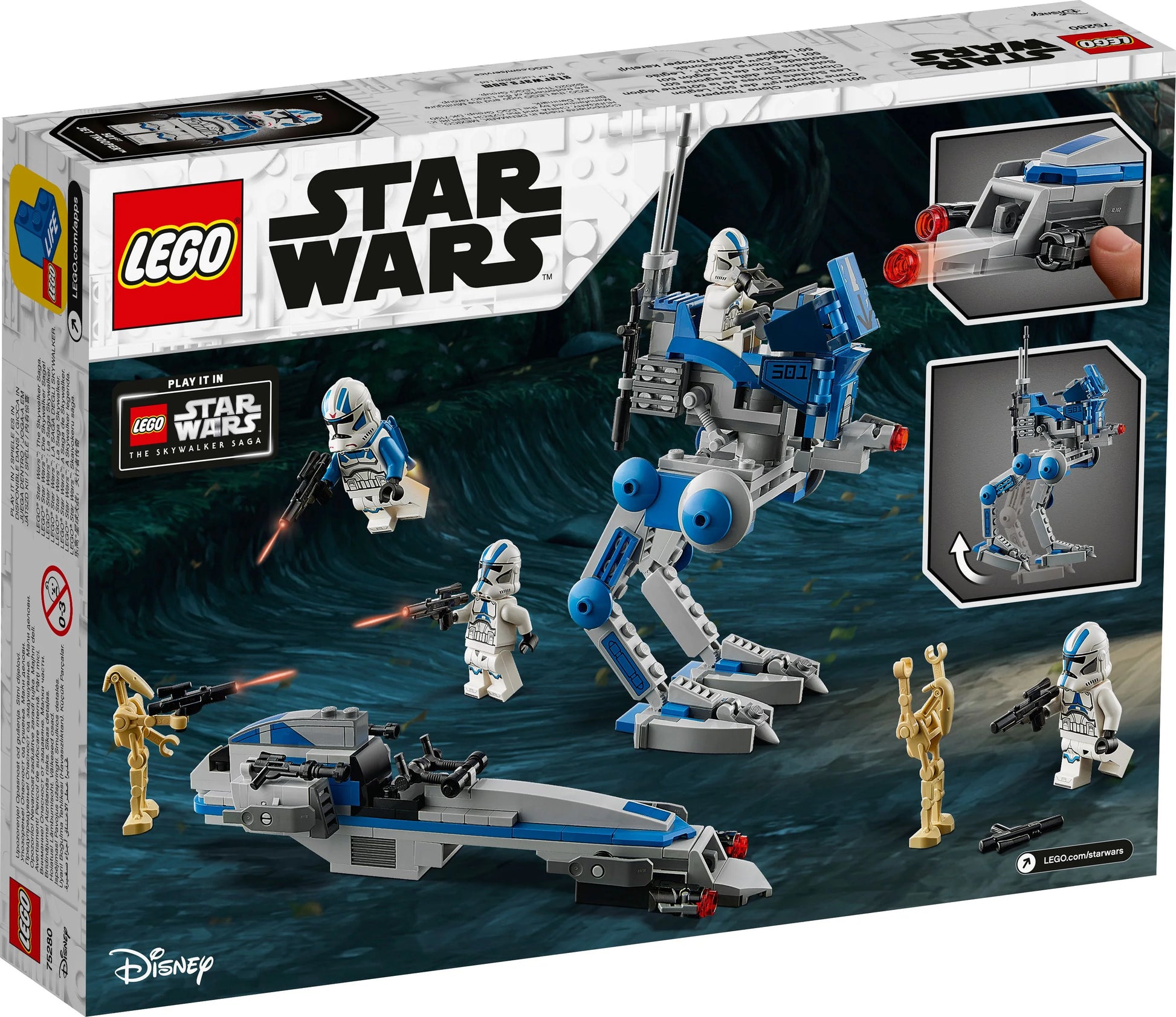 - Incluye: 4 minifiguras LEGO® (3 soldados clon de la 501 y 1 soldado jet de la 501) y 2 droides de combate, todos equipados con blásteres y accesorios.
