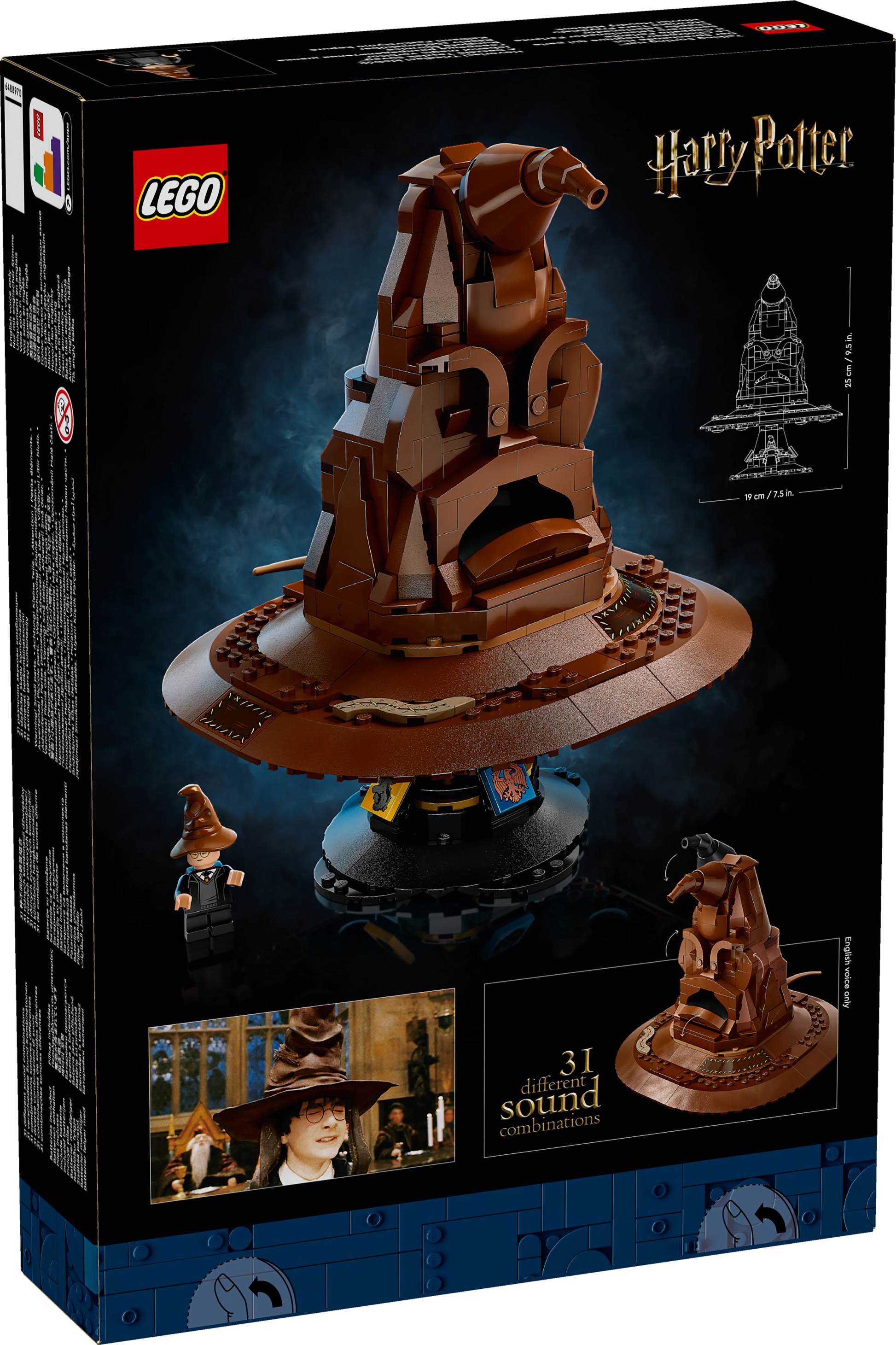 El sombrero se presenta sobre una base de exposición decorada con los escudos de Gryffindor™, Slytherin™, Hufflepuff™ y Ravenclaw™, e incluye una minifigura de Harry Potter™ con el sombrero puesto para completar esta pieza única de colección.