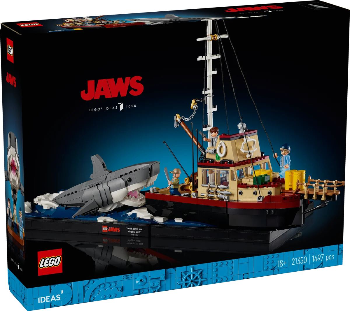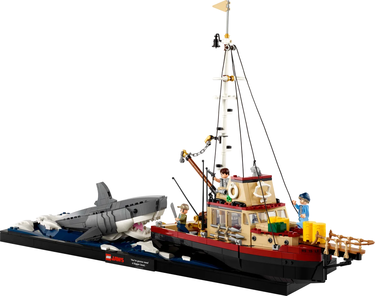 Incluye 3 minifiguras de personajes clásicos: el jefe Martin Brody, Matt Hooper y Sam Quint, cada uno con accesorios temáticos como una caña de pescar, arpón, revólver, cámara, brújula y cañón arponero. Y por supuesto, la base del modelo lleva impresa la icónica frase: “You’re gonna need a bigger boat.”