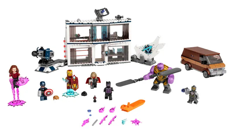 Incluye minifiguras de Thor, Iron Man, Capitán América, Black Panther, la Bruja Escarlata y un guerrero Chitauri, así como una figura de Thanos con su espada de doble hoja y una microfigura de Ant-Man. El complejo de los Vengadores está equipado con: