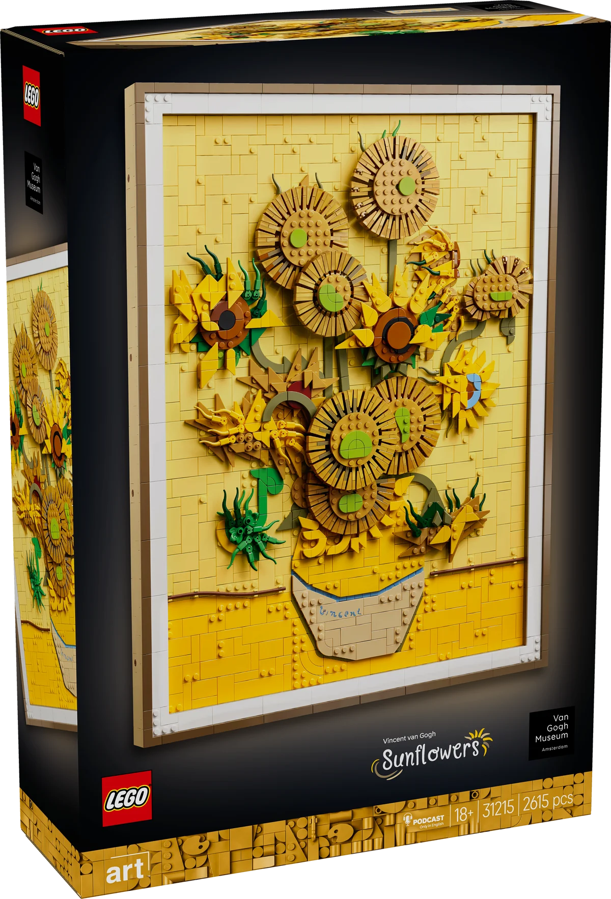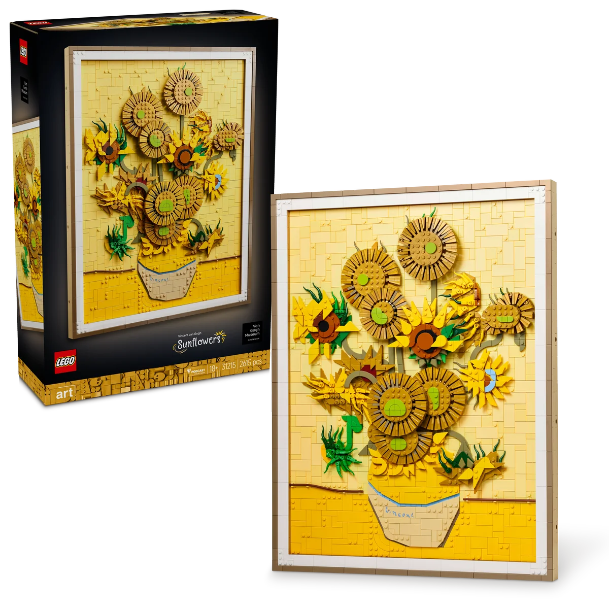 Con 2615 piezas LEGO®, este set te invita a sumergirte en el proceso creativo de Van Gogh, replicando sus famosos girasoles pintados en Arlés en 1889. El modelo incluye 16 girasoles con pétalos ajustables, un marco desmontable, colgador trasero y una baldosa con la firma del artista.