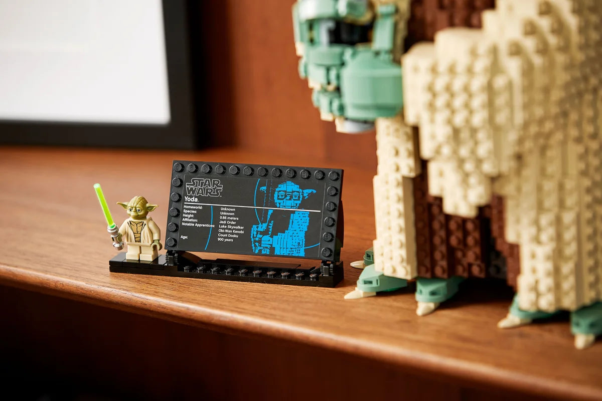 - Minifigura LEGO® de Yoda con su propia espada láser y base expositora.